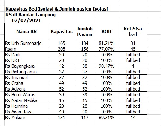 Data kapasitas bed Isolasi dan Jumlah pasien isolasi di Rumah Sakit di Bandar Lampung tersebar di sejumlah grup WatsApp (WA).