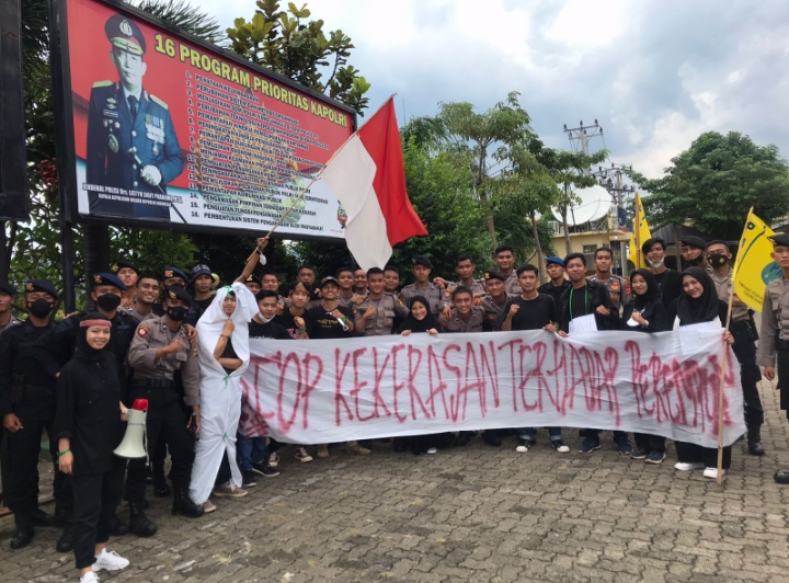 BANDAR LAMPUNG, PL– Aktivis mahasiswa yang tergabung dalam Gerakan Peduli Perempuan turut memeriahkan lomba Orasi Unjuk Rasa Piala Kapolri 2021 yang dilaksanakan di Lapangan Apel Mapolda Lampung, 2 Desember.