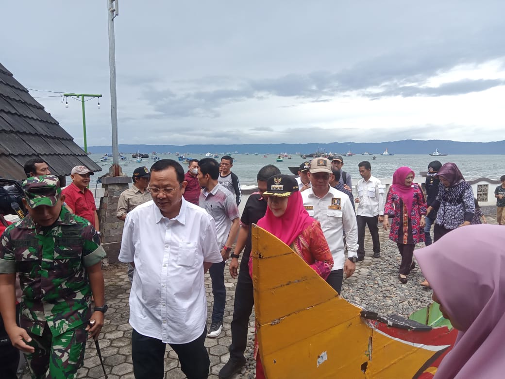Hj Dewi Handajani S.E, M.M Bupati dan Am Syafe’i Wakil Bupati Tanggamus bersama Heri Agus Setiawan S.Sos Ketua DPRD Tanggamus menyambut kunjungan kerja DPR RI dan Kementerian Kelautan dan Perikanan (KKP) dalam rangka pendampingan perlindungan dan pemberdayaan nelayan (Bakti Nelayan) di muara indah Kotaagung, Sabtu (15/04/23).