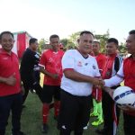 LAMPUNG SELATAN, PL– Bupati Lampung Selatan H. Nanang Ermanto lakukan pertandikan sepak bola persahabatan dalam laga Friendly Match PGRI Candipuro FC VS Red Brother FC, di Lapangan Desa Rawa Selapan, Kecamatan Candipuro, Jumat (09/06/2023).
