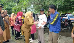 SEMAKA, PL – Bupati Tanggamus Hj. Dewi Handajani menyerahkan bantuan sembako untuk korban banjir di Kecamatan Semaka di aula kantor kecamatan, Selasa (4/7/2023).