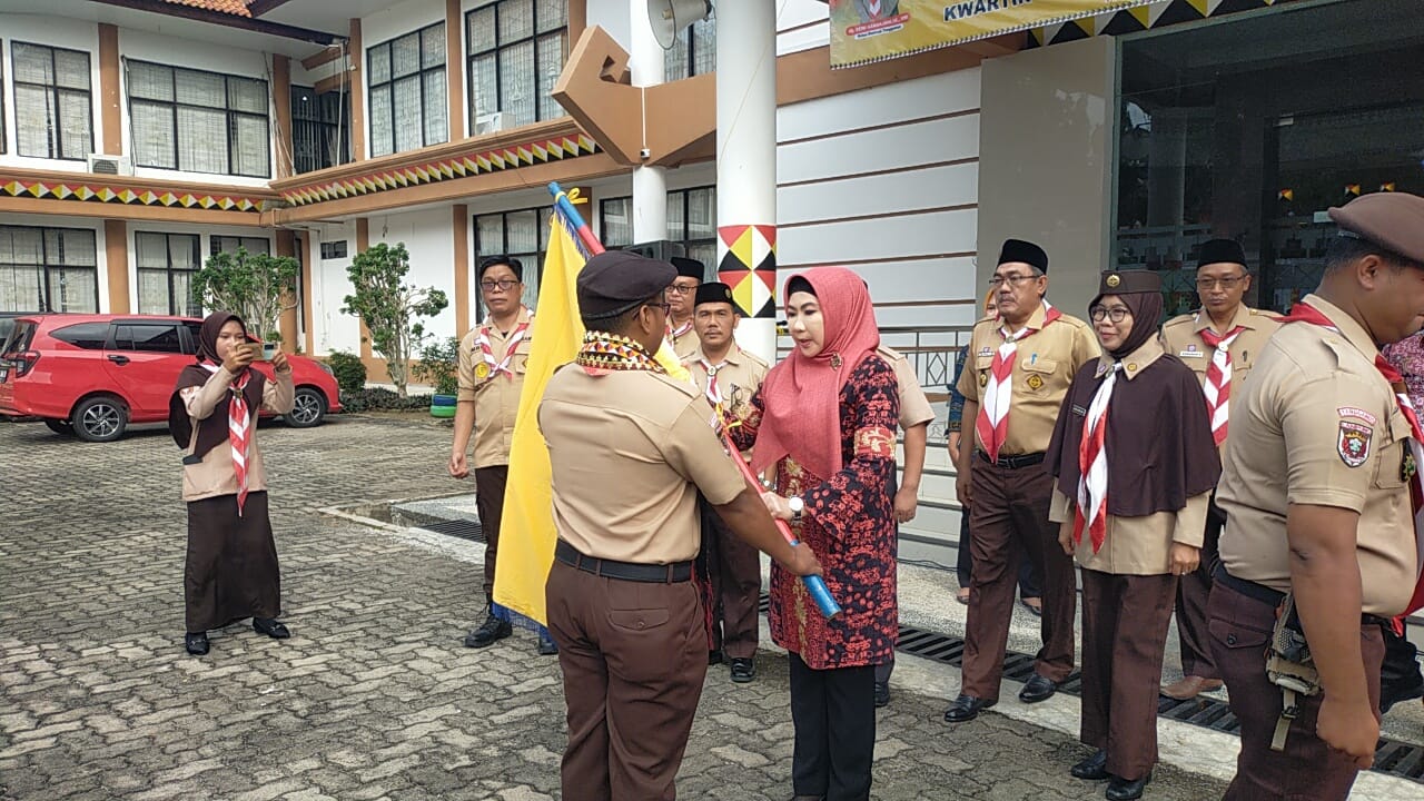 TANGGAMUS, PL— Bupati Tanggamus Hj. Dewi Handajani memimpin upacara pelepasan Raimuna nasional XII tahun 2023 kwartir cabang gerakan pramuka setempat di halaman sekretariat bupati pada Jumat, 11 Agustus 2023.