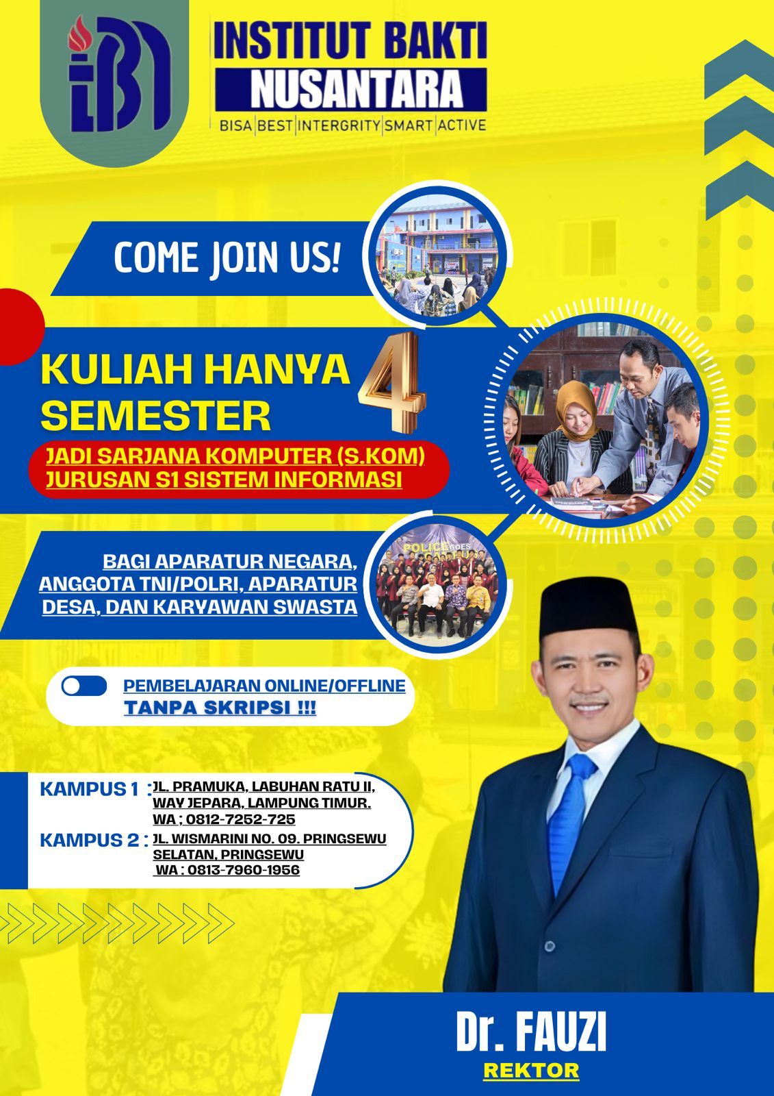 PANTAU LAMPUNG – Dalam upaya meningkatkan akses pendidikan bagi masyarakat, Institut Bhakti Nusantara (IBN) Lampung serta Sekolah Tinggi Ilmu Tarbiyah (STIT) Pringsewu kini menawarkan program kuliah singkat empat semester, membuka jalan menuju gelar sarjana tanpa perlu menyusun skripsi.