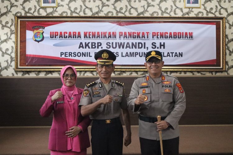 Dalam amanatnya, Kapolres Lampung Selatan menyampaikan ucapan selamat kepada AKBP Suwandi, S.H atas pangkat pengabdian yang disandangnya. Ia menjelaskan bahwa kenaikan pangkat pengabdian perlu disyukuri karena bukan merupakan hak anggota, melainkan sebuah prestasi yang didapat oleh anggota dengan penilaian secara berkala terhadap anggota Polri.***