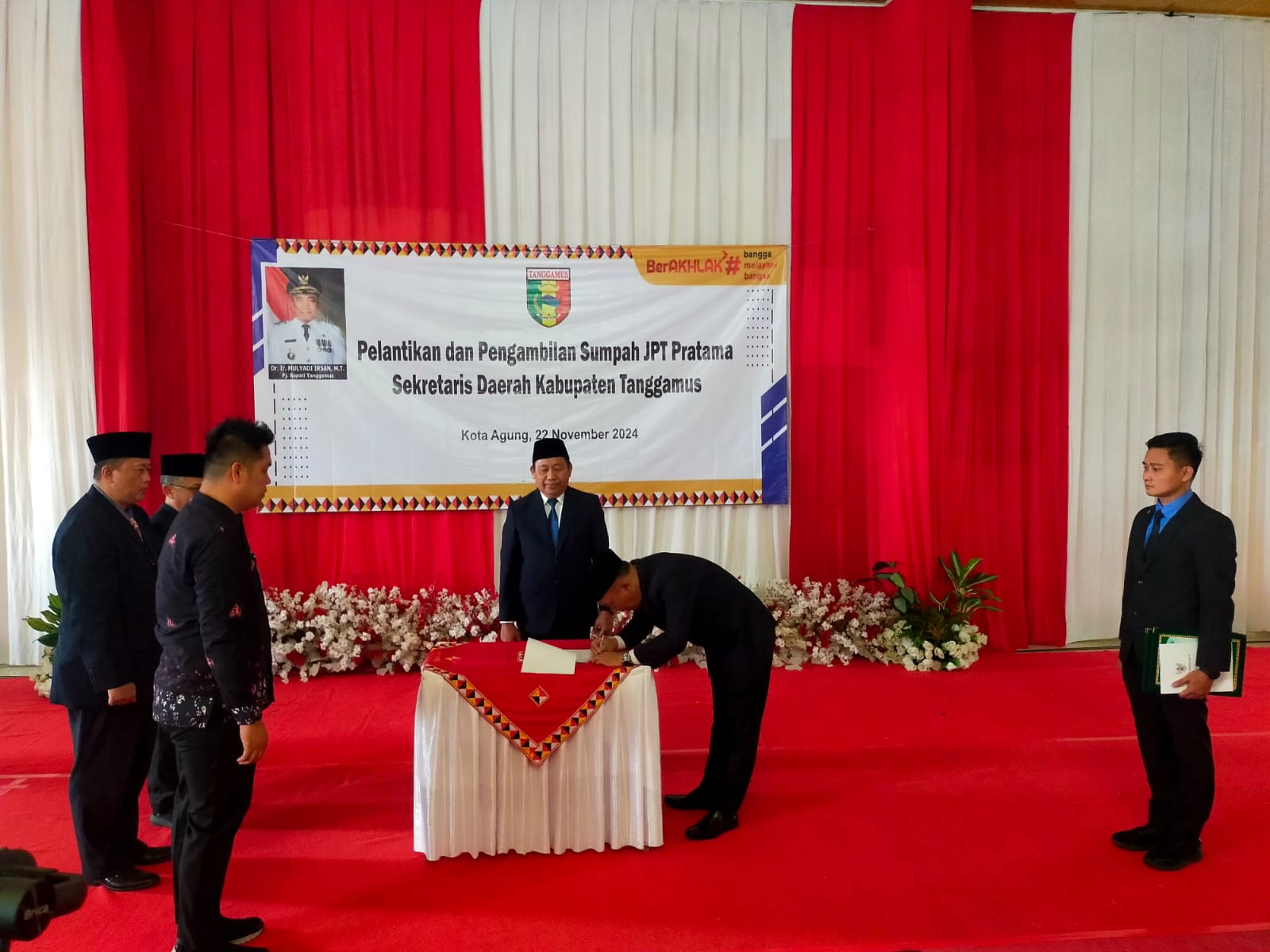 Sebelum prosesi pelantikan, Edwin, Kabid Pengembangan BKSDM, membacakan surat keputusan Bupati Tanggamus Nomor: 800.1.3.3/1071/43/2024 tentang Pengangkatan dalam Jabatan Pimpinan Pratama Sekretaris Daerah Kabupaten Tanggamus. Dalam keputusan tersebut, disebutkan bahwa pengangkatan tersebut didasarkan pada serangkaian proses seleksi terbuka yang melibatkan berbagai pihak dan dilaksanakan pada bulan Oktober hingga November 2024.