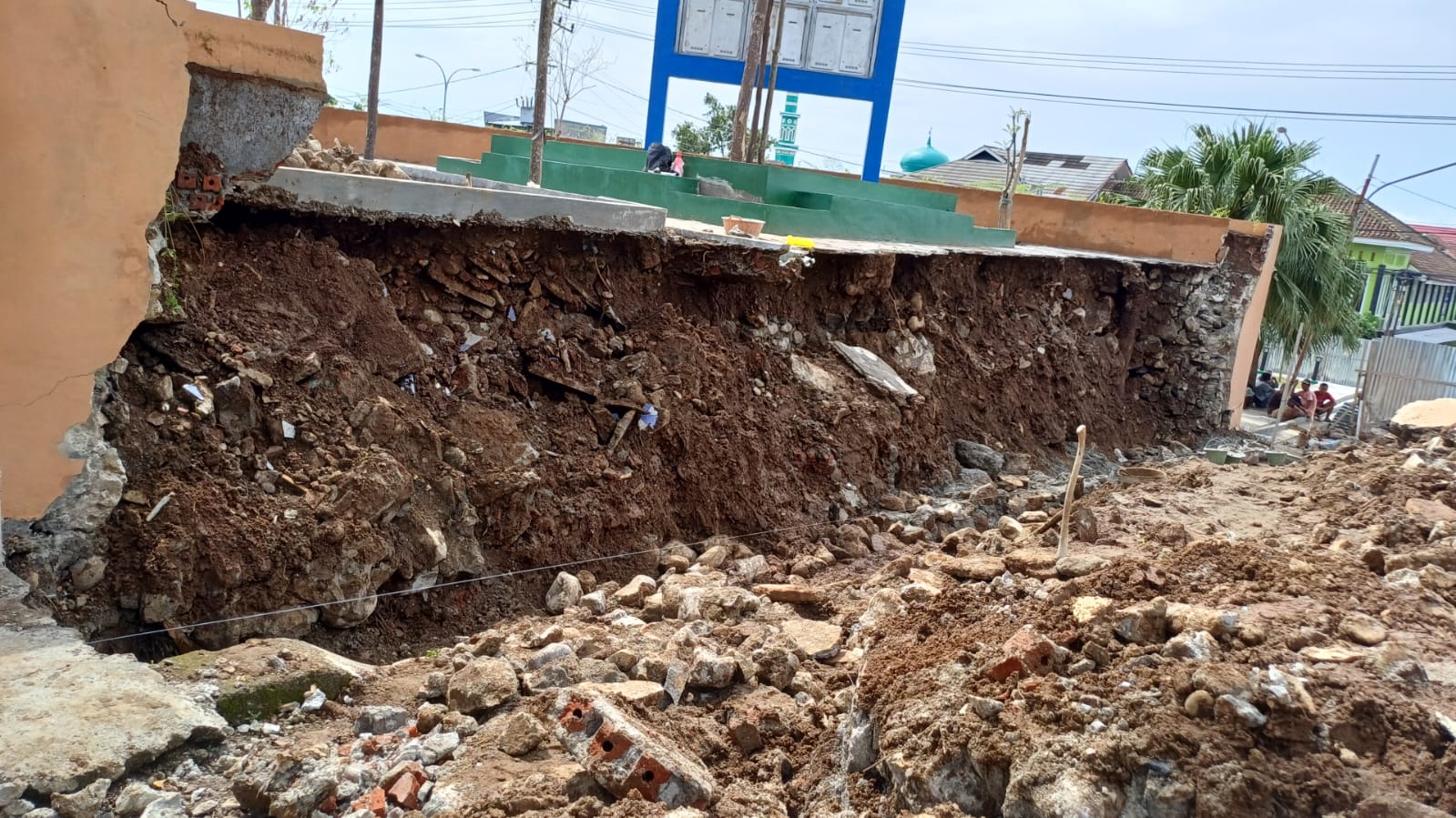PANTAU LAMPUNG– Talud penahan tanah (TPT) di Taman Ir Soekarno, Kota Agung, mengalami ambrol pada Jumat malam, 10 Januari 2025, sekitar pukul 21.00 WIB. Ambrolnya dinding beton tersebut terjadi tepat di depan Kantor Dinas Bupati Tanggamus, Kelurahan Kuripan, Kecamatan Kota Agung.