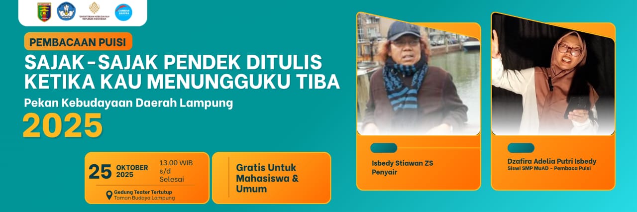 PANTAU LAMPUNG — Pekan Kebudayaan Daerah (PKD) Lampung resmi dibuka hari ini, Senin 29 Oktober 2025, oleh UPT Taman Budaya Lampung, Dinas Pendidikan dan Kebudayaan Provinsi Lampung. Acara yang berlangsung hingga Sabtu, 25 Oktober 2025, dijadwalkan menampilkan rangkaian kegiatan seni dan budaya dari seniman serta komunitas lokal, termasuk seminar seni, pementasan teater, dan pertunjukan puisi yang menjadi puncak hari terakhir PKD.