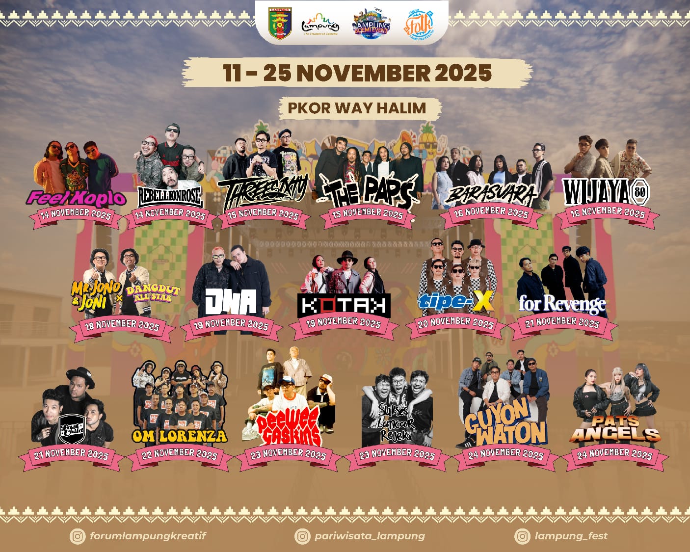 PANTAU LAMPUNG— gelaran lampung fest 2025 semakin mendekati puncak euforianya. salah satu segmen paling ditunggu, lampungphoria, siap menghadirkan pesta musik lintas genre yang akan mengguncang panggung utama pkor way halim selama festival berlangsung pada 11–25 november 2025. festival ini diproyeksikan menjadi ajang musik terbesar di provinsi lampung tahun ini, menyatukan berbagai kalangan masyarakat dan komunitas kreatif.