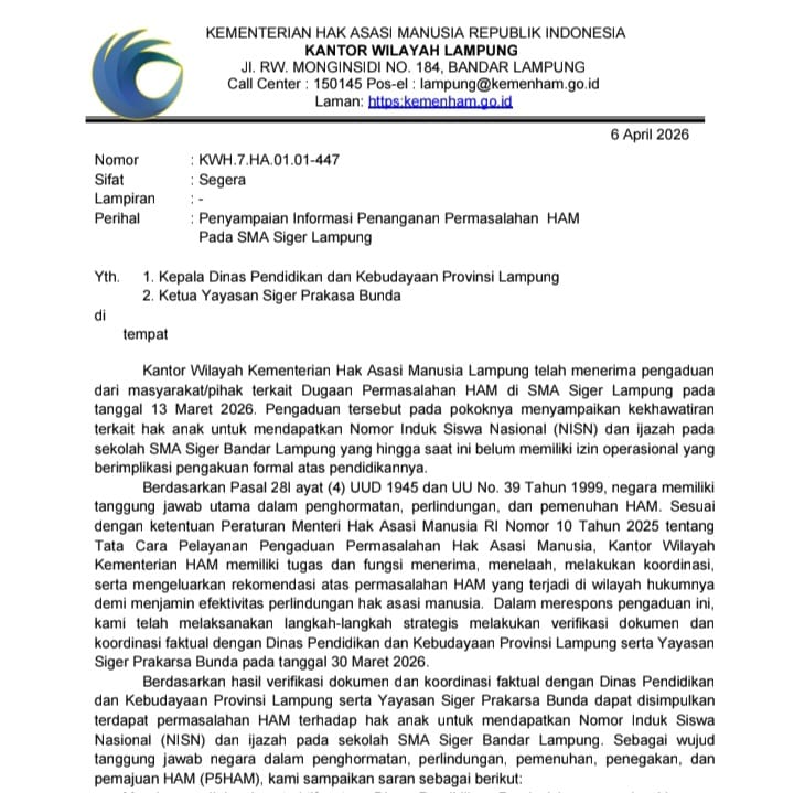 “Berdasarkan hasil verifikasi dokumen dan koordinasi faktual, terdapat permasalahan HAM terhadap hak anak untuk mendapatkan NISN dan ijazah pada SMA Siger Bandar Lampung,” demikian isi surat yang ditandatangani Kepala Kanwil Kemenham Lampung, Basnamara.