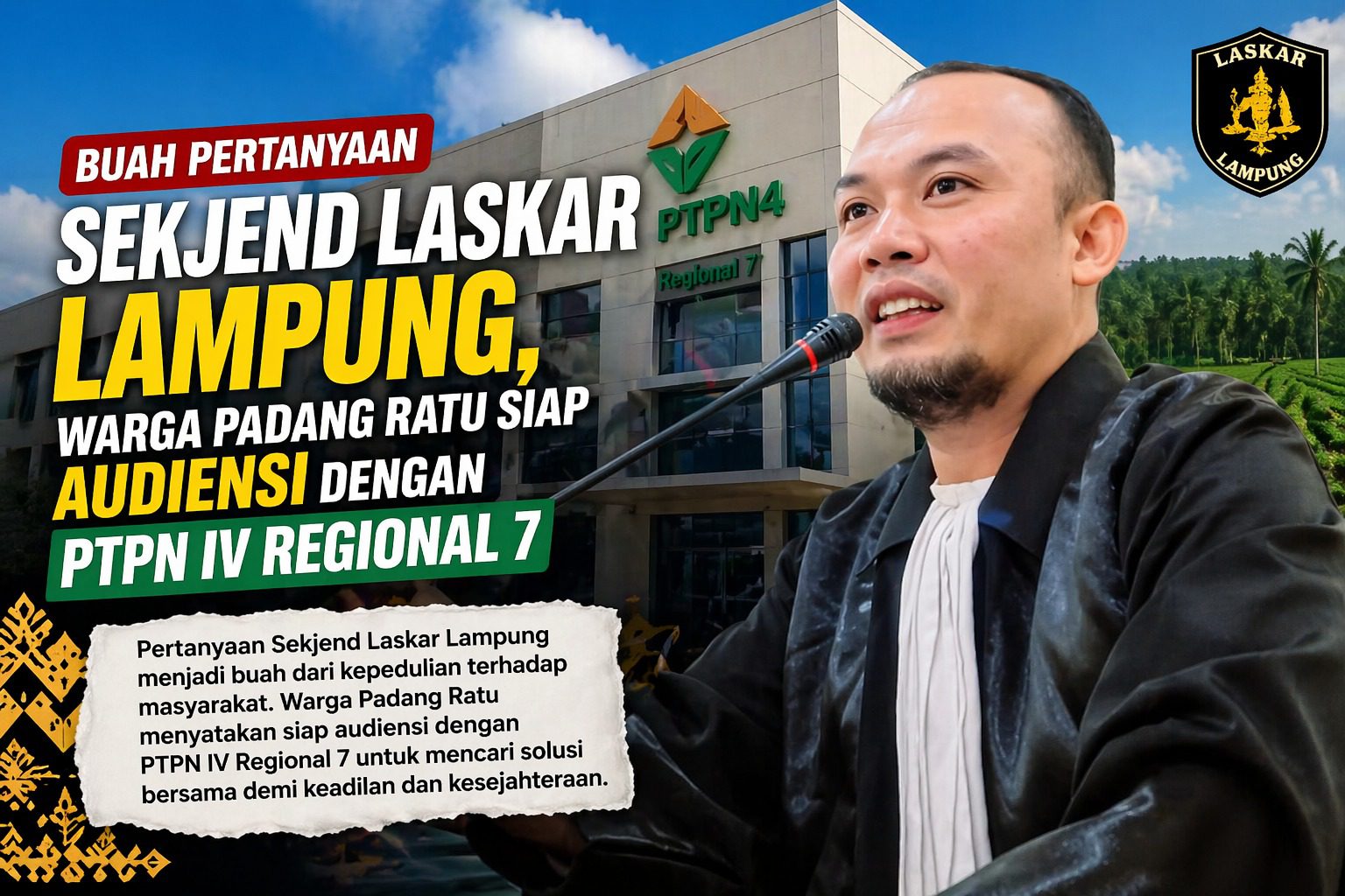 Langkah ini merupakan tindak lanjut dari pertanyaan terbuka Sekretaris Jenderal DPP Laskar Lampung Indonesia, Panji Nugraha AB, terkait kewajiban perusahaan dalam merealisasikan hak plasma bagi masyarakat sekitar perkebunan.