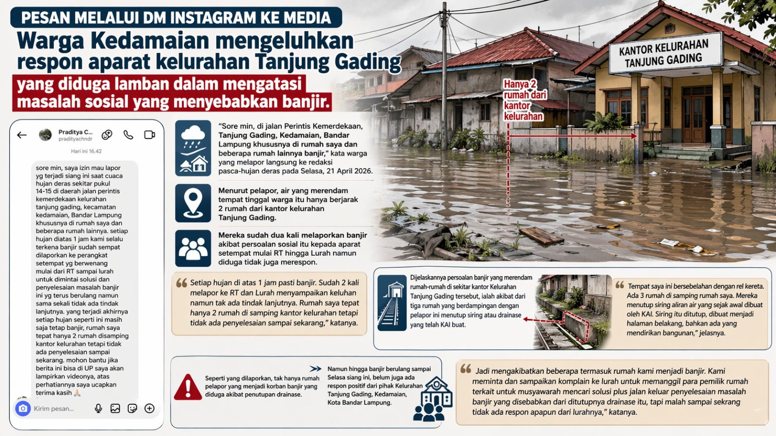 PANTAU LAMPUNG- Warga Kelurahan Tanjung Gading, Kecamatan Kedamaian, Kota Bandar Lampung mengeluhkan lambannya penanganan pemerintah kelurahan terkait persoalan banjir yang terus terjadi di wilayah mereka setiap kali hujan deras mengguyur.