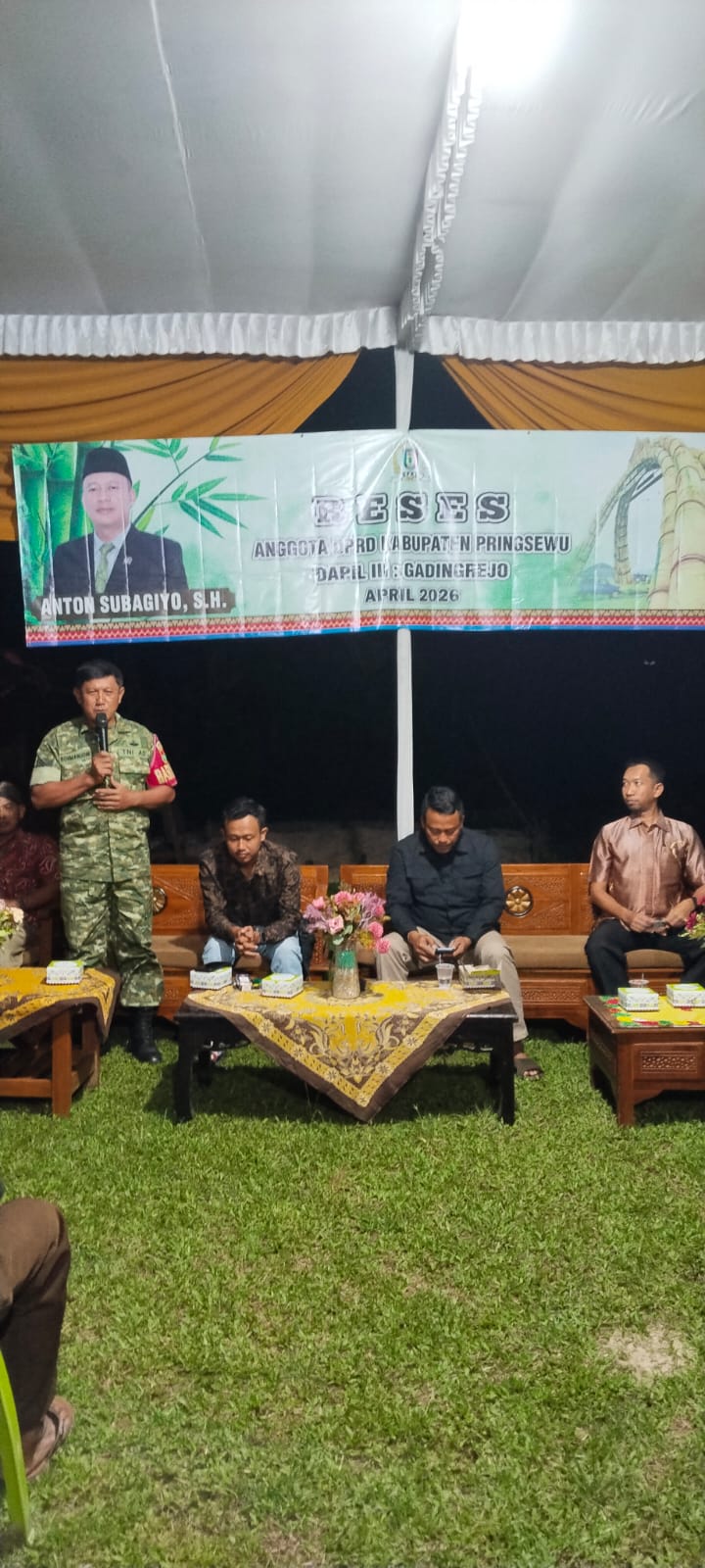 Reses yang digelar di Dusun Pujosari, Pekon Mataram, Kecamatan Gadingrejo, pada Sabtu (25/4/2026) ini dihadiri berbagai unsur masyarakat, mulai dari tokoh masyarakat, aparat keamanan seperti Babinsa dan Bhabinkamtibmas, kepala pekon, hingga kelompok tani dan ibu-ibu setempat.