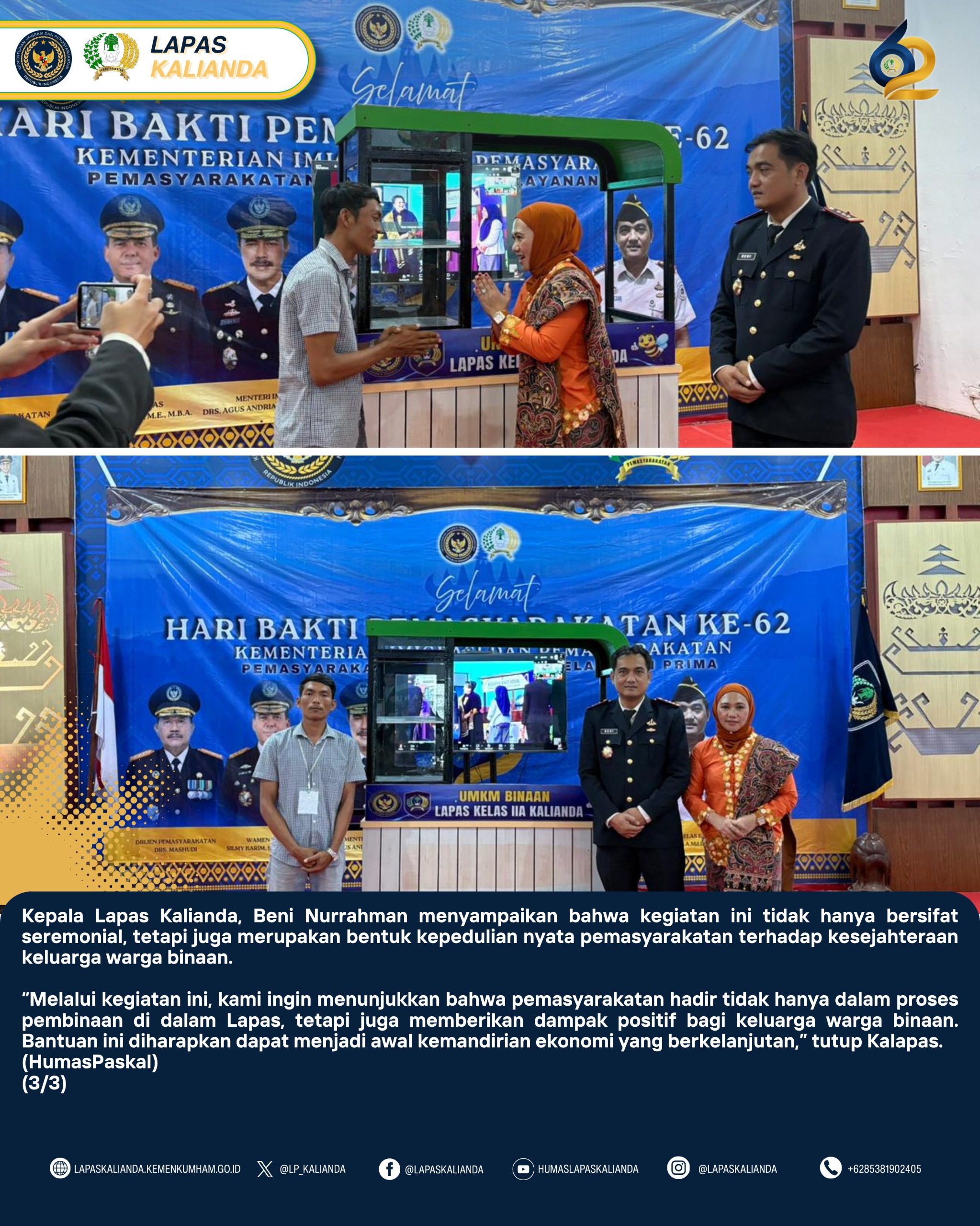 “Melalui kegiatan ini, kami ingin menunjukkan bahwa pemasyarakatan tidak hanya fokus pada pembinaan di dalam Lapas, tetapi juga memberikan dampak positif bagi keluarga warga binaan. Bantuan ini diharapkan menjadi awal kemandirian ekonomi yang berkelanjutan,” ujarnya.