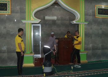 Polres Lampung Selatan Bersih-bersih di Masjid Baitun Nur Sukajaya