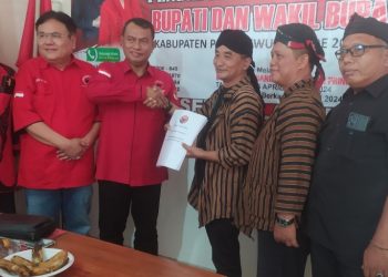 PANTAU LAMPUNG - Bakal calon (balon) wakil bupati (wabup) Pringsewu, Andreas Andoyo mengembalikan formulir pendaftaran ke DPC PDI Perjuangan Pringsewu, ...